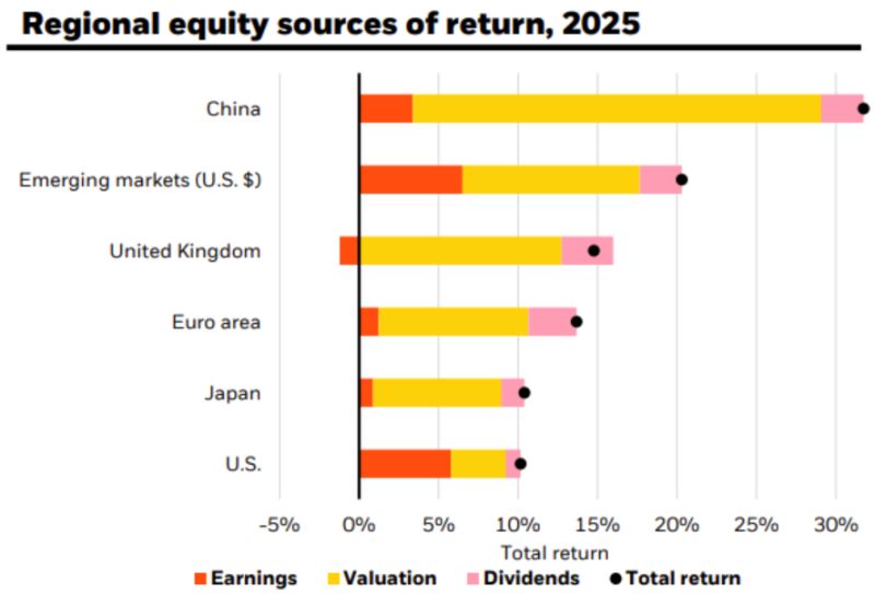 International equity markets were valuation-driven, doing the long-awaited fundamental catch-up phase. China leads the total return, mainly via multiple expansion.